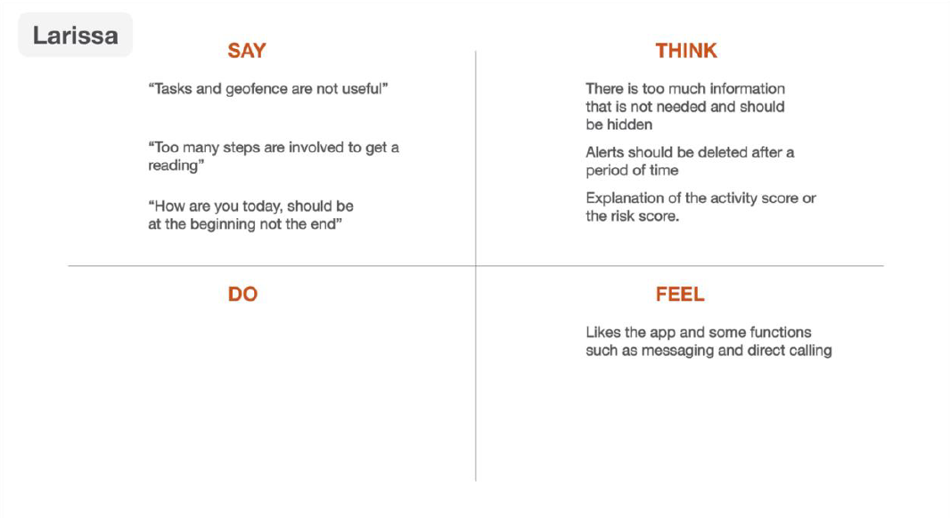 An Empathy Map is a technique whereby we try to understand the user and discover insights after an interview with the user. A quadrant is used to breakdown proceedings of the interview into four sections, namely Say, Do, Think, Feel. As they are worded, we write out what the user said during the interview, what they did, how they perceived things (thought), and how they felt. It is usually in the last two quadrants (Think and Feel) that insights are discovered, and design opportunities are cultivated.